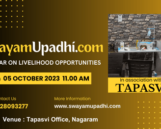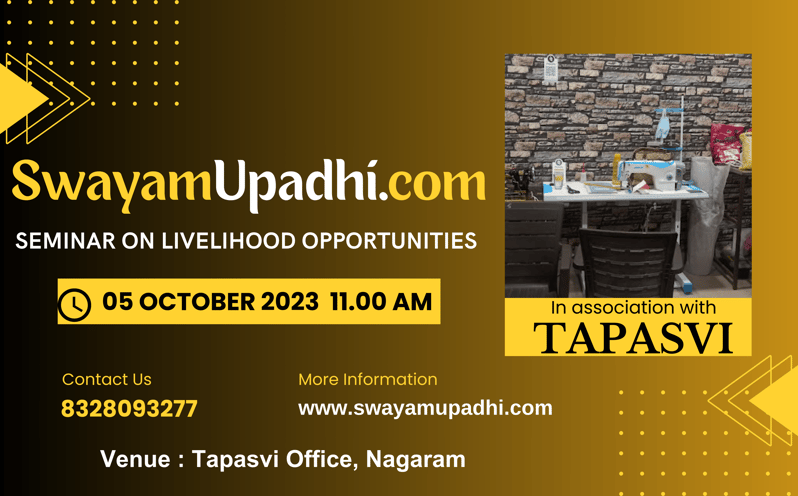 SwayamUpadhi.com Social Ventures is organizing a Seminar on Livelihood Opportunities on 05.10.2023 in association with TAPASVI an NGO working for Women and Child empowerment for the past 26 years. The event is focused on creating livelihood opportunities for women.