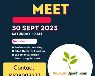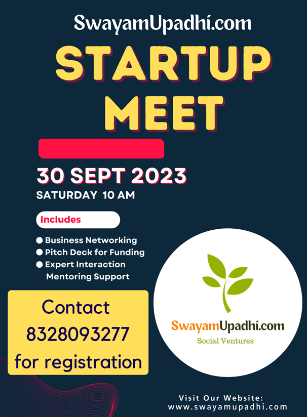 To empower entrepreneurs and startups, SwayamUpadhi.com Social Ventures is organising SWAYAMUPADHI.COM STARTUP MEET on 30.09.2023. All entrepreneurs and those who are interested in starting their own business ventures are welcome to attend the program.