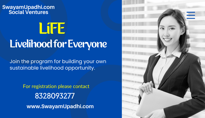 LIFE (Livelihood for Everyone) is an unique signature livelihood program launched by SwayamUpadhi.com Social Ventures to help everyone with sustainable livelihood through entrepreneurship or working on their own from Common Facility Centers or their residences . As part of this program, we understand the needs, capabilities and aspirations of participants and suggest suitable livelihood programs for them. Anyone can join this program. As part of this program we keep participants updated with latest opportunities so that they can decide to work on the opportunity that interests them.